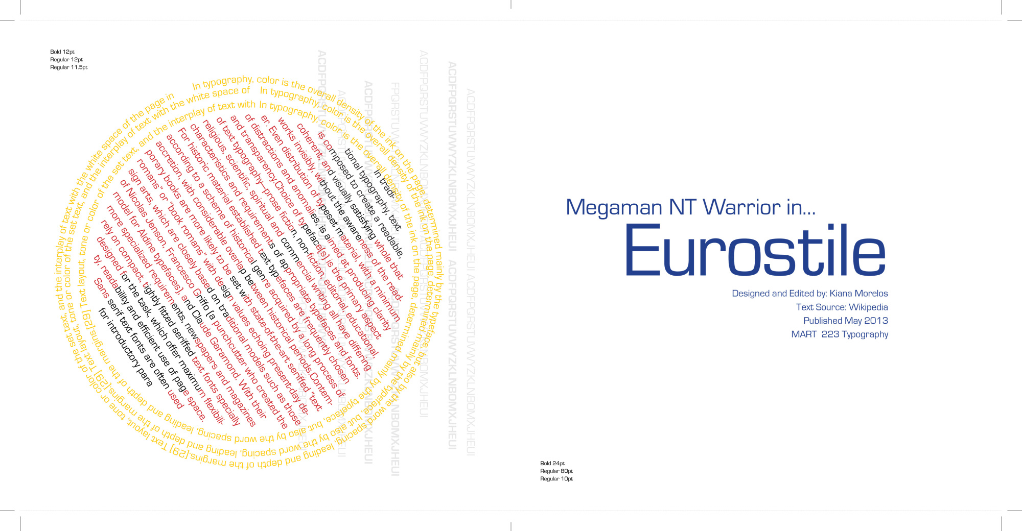 The goal with this class project was to create a type specimen book which utilized the type in as many ways as possible. We were free to choose the theme and typeface. For this project I chose Eurostile, and 'Megaman' for the theme, a beloved cartoon/8-bit video game character.